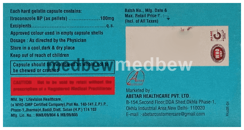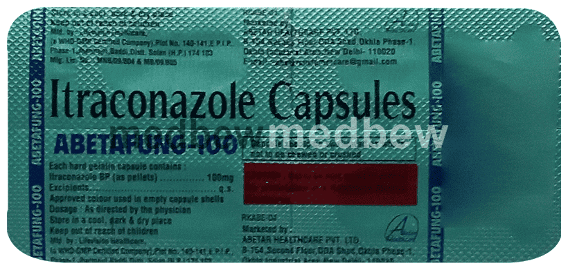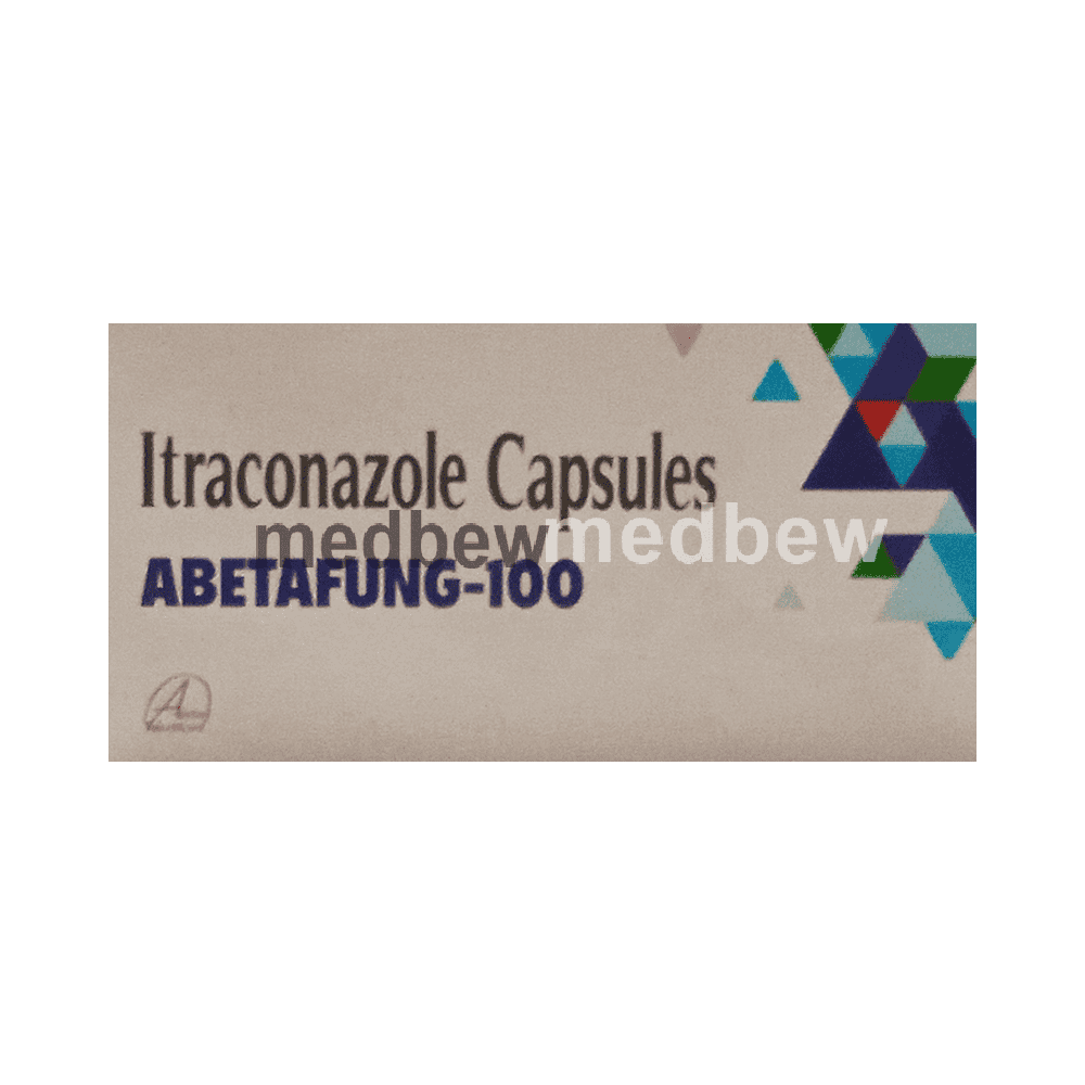 Abetafung 100 Capsule belongs to a group of medicines called antifungals. It works by stopping the growth of fungi and is used to treat infections of the mouth, throat, vagina, and other parts of the body including fingernails and toenails. It kills fungi by destroying the fungal cell membrane.