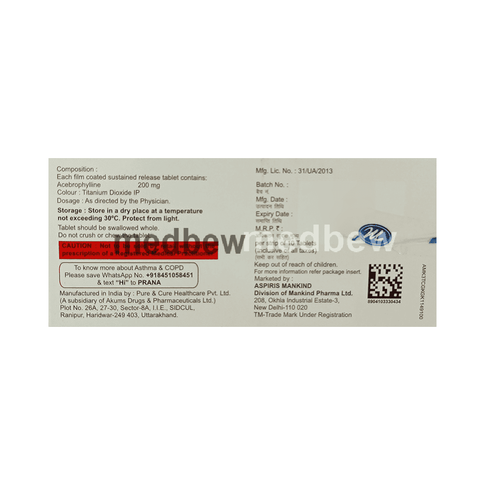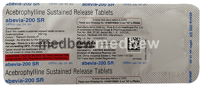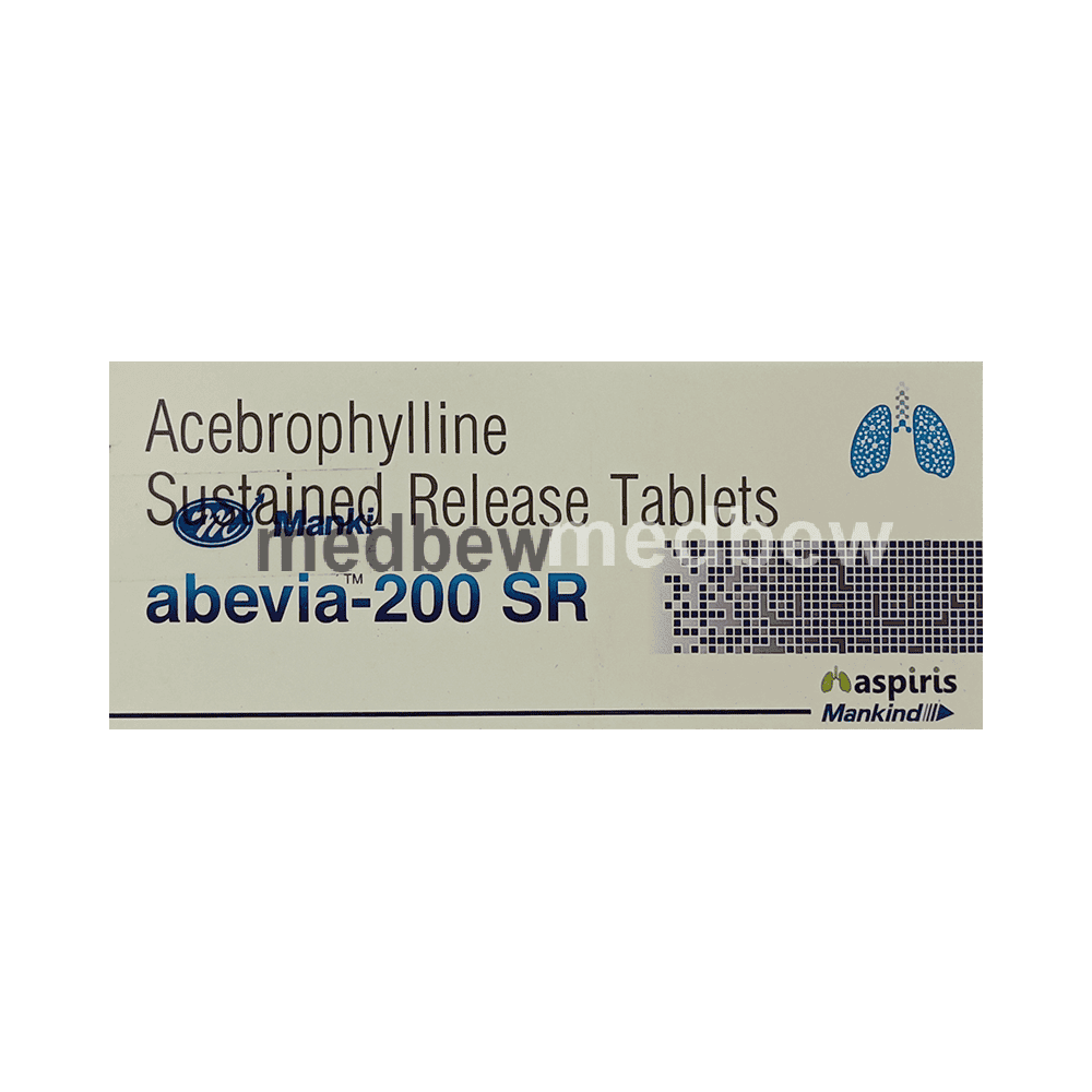 Abevia 200 SR Tablet is used to treat and prevent symptoms of asthma and chronic obstructive pulmonary disorder (a lung disorder in which flow of air to the lung is blocked). It helps in relaxing the muscles of the air passages, thus widening it and making it easier to breathe.