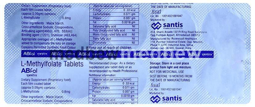 ABfol Tablet is a supplement of folate which is also known as folic acid. It is used to treat or prevent the low levels of folate in the body. Folate plays an essential role in the production of red blood cells, and its deficiency can lead to anemia. Take it in the exact dose and duration as prescribed by your doctor.