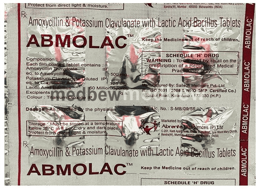 Abmolac Tablet is a combination medicine that is used to treat various types of bacterial infections. It fights against the microorganisms to prevent their growth and further spread of the infection. It also prevents diarrhea which may occur as side effect of this medicine.