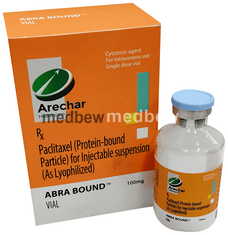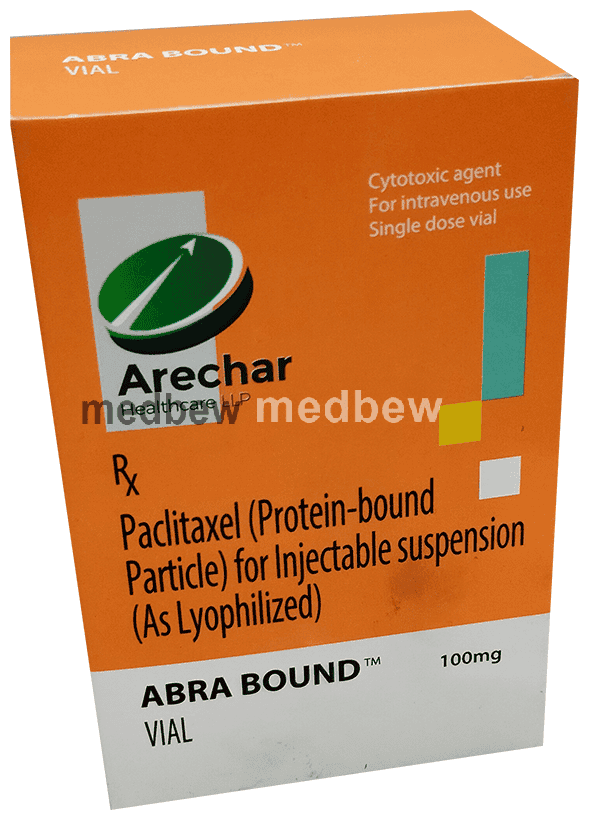 Abra Bound Suspension for Injection is an anti-cancer medication used for the treatment of breast cancer, pancreatic cancer and non-small cell lung cancer.It is given as an injection by a qualified medical professional. Your doctor will decide what dose is necessary and how often you need to take it. This will depend on what you are being treated for and may change from time to time. You should take it exactly as your doctor has advised. Taking it in the wrong way or taking too much can cause very serious side effects. It may take several weeks or months for you to see or feel the benefits but do not stop taking it unless your doctor tells you to.Some common side effects of this medicine include nausea, vomiting, and weakness. It may also cause serious side effects such as swelling of hands, lips, hair loss, and weight gain. To reduce these side effects your doctor may suggest some medication along with it. But, inform your doctor if you notice unexplained bruising or bleeding, sore throat, mouth ulcers, high temperature (fever). This medicine may reduce the number of blood cells (decrease red blood and white blood cells) in your blood, thereby, increasing the susceptibility to infections. Regular blood tests are required to check your blood cells and liver function.Before taking it, tell your doctor if you have heart disease, liver, or kidney problems or are taking any medicines to treat infections. Many other medicines can affect, or be affected by, this medicine so let your doctor know all medications you are using. This medicine is not recommended during pregnancy or while breastfeeding. The use of effective contraception by both males and females during treatment is important to avoid pregnancy.