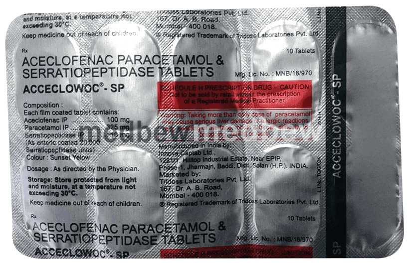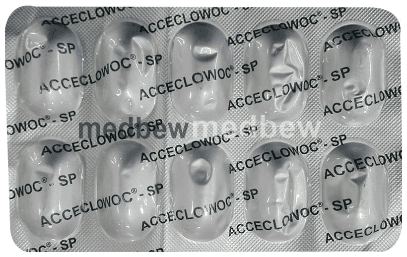 Acceclowoc-SP Tablet is a combination medicine used to relieve pain and swelling in various conditions like muscle pain, joint pain, and postoperative pain. Thus, it effectively alleviates pain and inflammation in conditions like rheumatoid arthritis, ankylosing spondylitis, and osteoarthritis.