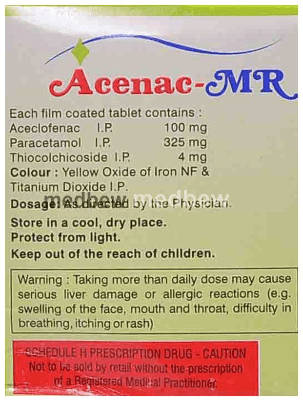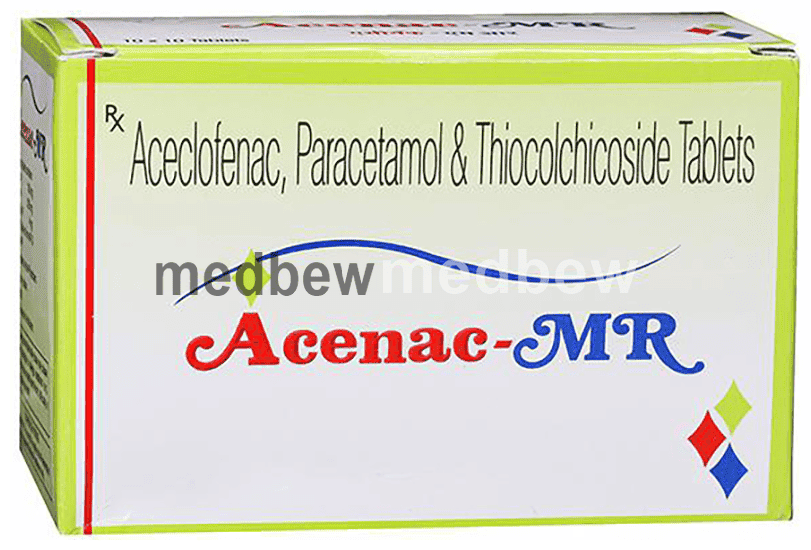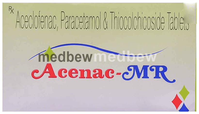 Acenac-MR Tablet is a combination of a muscle relaxant (Thiocolchicoside) and two pain relievers (Aceclofenac, Paracetamol). The muscle relaxant works on the centers in the brain and spinal cord to relieve muscle stiffness or spasm and improve movement of muscles. The pain relievers work by blocking the release of certain chemical messengers in the brain that cause pain and inflammation (redness and swelling).