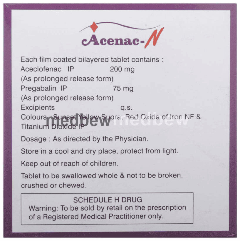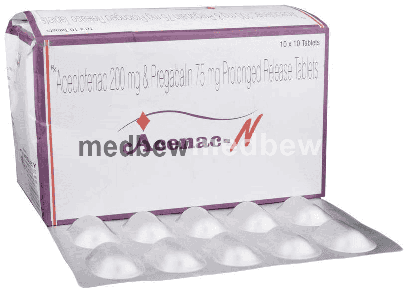 Acenac-N Tablet PR is a combination of two medicines: Aceclofenac and Pregabalin which relieve pain. Aceclofenac is a non-steroidal antiinflammatory drug (NSAID) which works by blocking the release of certain chemical messengers that cause fever, pain and inflammation (redness and swelling). Pregabalin is an alpha 2 delta ligand which decreases pain by modulating calcium channel activity of the nerve cells.