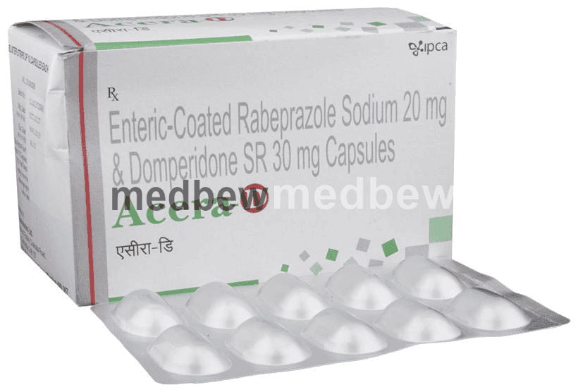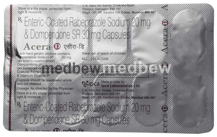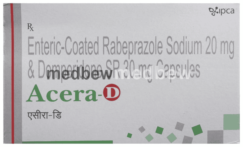 Acera-D Capsule SR is a combination medicine used to treat gastroesophageal reflux disease (Acid reflux) and peptic ulcer disease by relieving the symptoms of acidity such as heartburn, stomach pain, or irritation. It also neutralizes the acid and promotes easy passage of gas to reduce stomach discomfort.