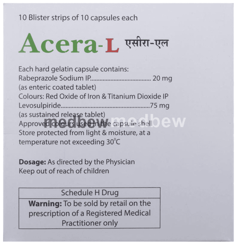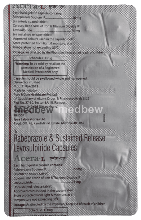 Acera-L Capsule SR is a prescription medicine which is used in the treatment of gastroesophageal reflux disease (acid reflux), intestinal ulcers, and irritable bowel syndrome. It reduces excess acid production in the stomach and prevents the reflux of stomach acid into the food pipe.