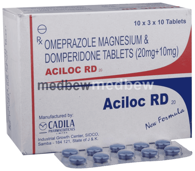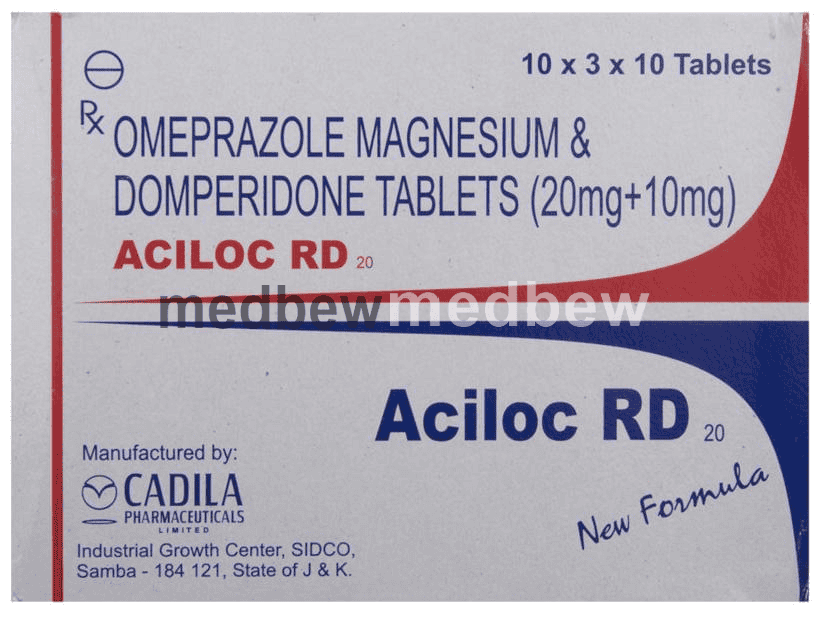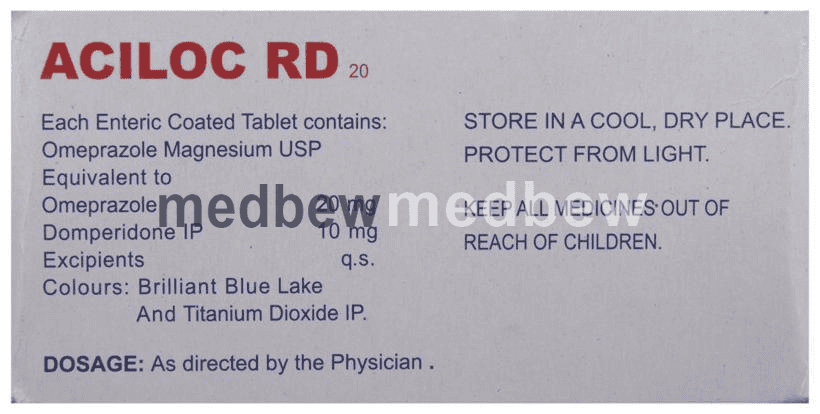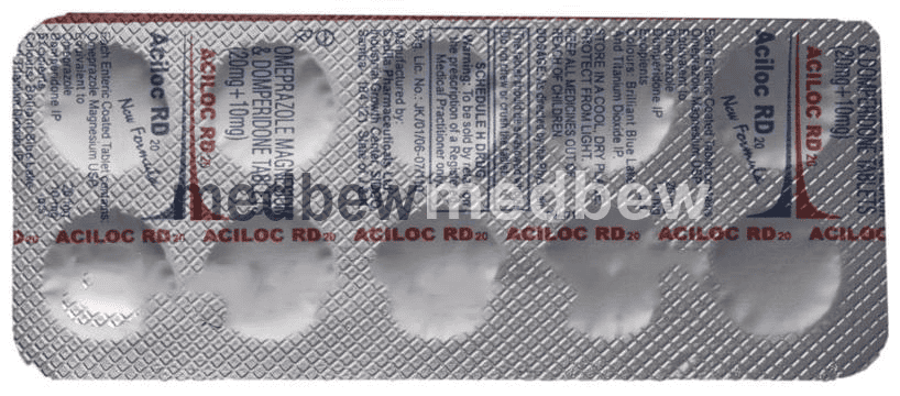Aciloc RD 20 Tablet is a prescription medicine used to treat gastroesophageal reflux disease (Acid reflux) and peptic ulcer disease by relieving the symptoms such as heartburn, stomach pain, or irritation. It also neutralizes the acid in the stomach and promotes easy passage of gas to reduce stomach discomfort.
