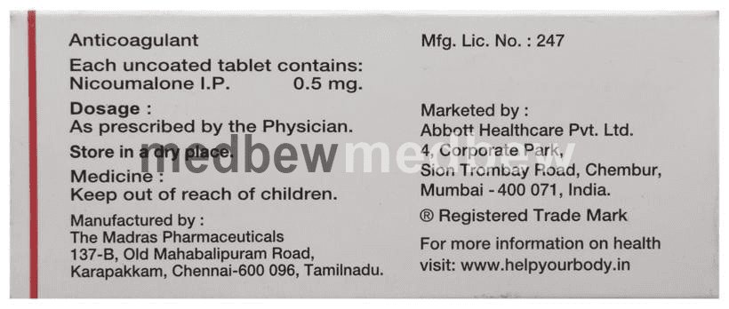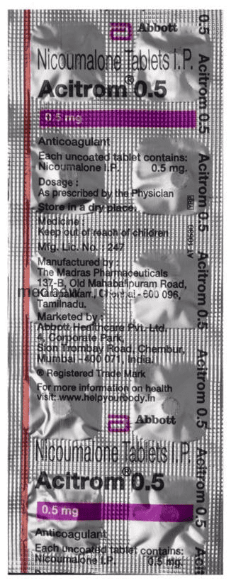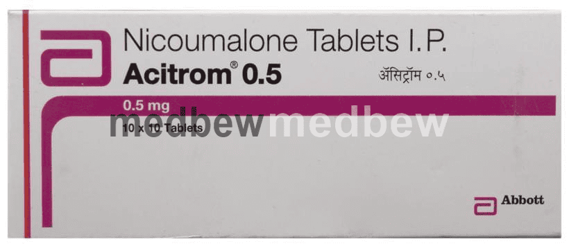 Acitrom 0.5 Tablet is an oral anticoagulant that helps prevent harmful blood clots in the legs, lungs, brain, and heart. It is used for deep vein thrombosis, pulmonary embolism, and stroke prevention.