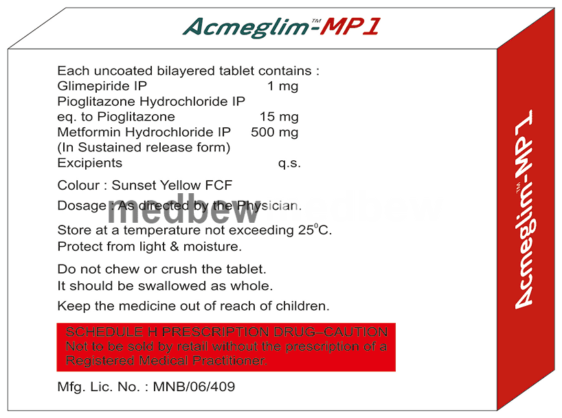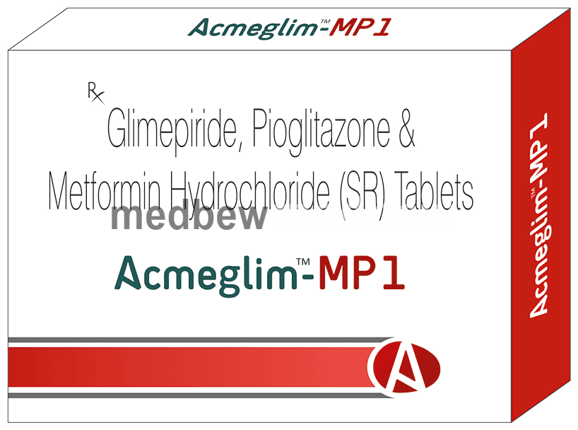 Acmeglim-MP 1 Tablet SR is a combination medicine that helps control blood sugar levels. This medicine is used together with diet and exercise to improve blood sugar control in adults with type 2 diabetes mellitus. It helps in proper utilisation of insulin, thereby lowering the blood sugar levels.