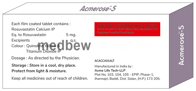 Acmerose 5 Tablet belongs to a group of medicines called statins. It is used to lower cholesterol and to reduce the risk of heart disease. Cholesterol is a fatty substance that builds up in your blood vessels and causes narrowing, which may lead to a heart attack or stroke.