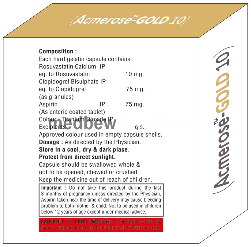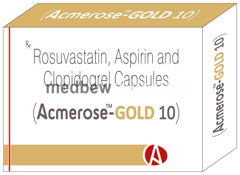 Acmerose-Gold 10 Capsule is used for prevention of heart attack. It is a combination of medicines that prevent clot formation in the blood vessels. It also helps to reduce increased cholesterol and triglycerides levels.