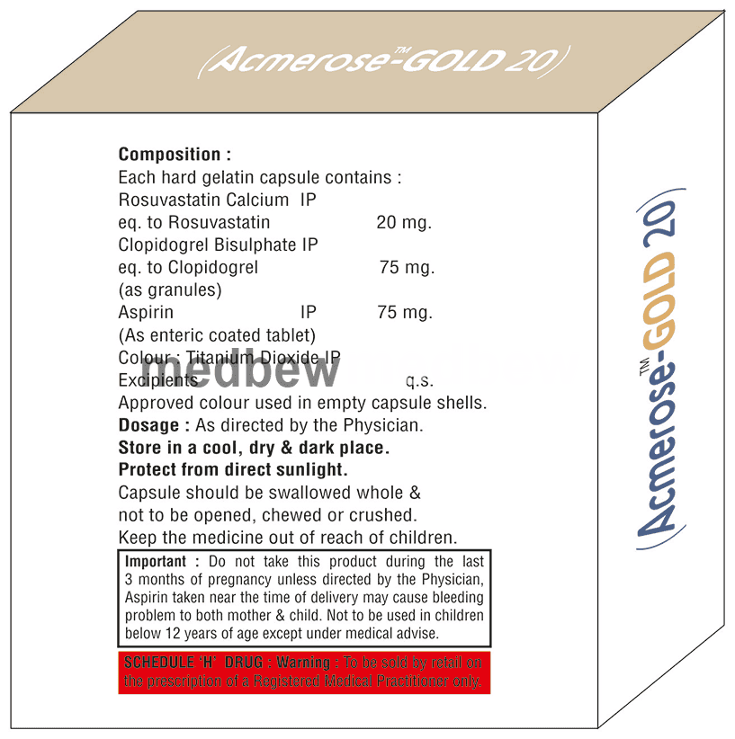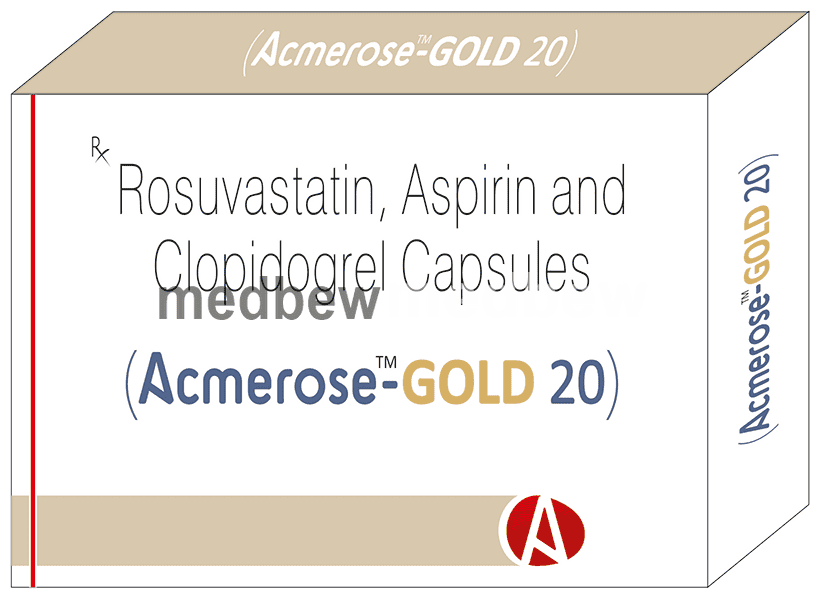 Acmerose-Gold 20 Capsule is used for prevention of heart attack. It is a combination of medicines that prevent clot formation in the blood vessels. It also helps to reduce increased cholesterol and triglycerides levels.