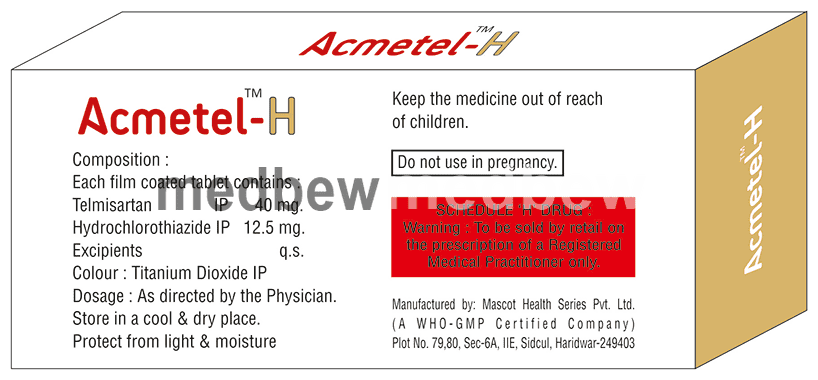 Acmetel-H Tablet contains two medicines, both of which help to control high blood pressure. It is generally used when one medicine alone is not controlling the blood pressure effectively. Lowering blood pressure helps to reduce your risk of having a heart attack or a stroke in the future.You can take