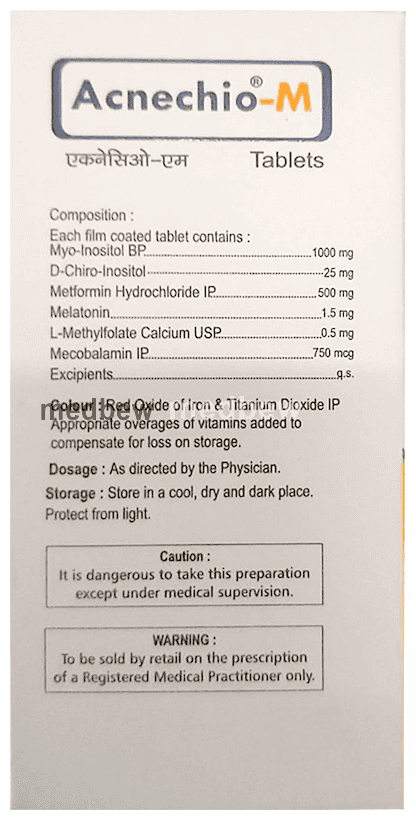 Acnechio-M Tablet is a combination of six medicines: Myo-Inositol, D-Chiro Inositol, Metformin, Melatonin, L-Methyl Folate Calcium and Methylcobalamin. These medicines work by enhancing body’s response to insulin and decreasing high levels of harmful substances (free radicals, homocysteine) in the body. This effect improves hormone balance and leads to more regular ovulation and menstrual cycles (periods) in PCOS.