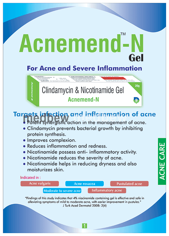 Acnemend-N Gel is a combination medicine that is used to treats acne. It minimizes excessive oil production, thus reduces inflammation. It also prevents the growth of the microorganisms that cause acne. This also helps to prevent pimples, blackheads, and whiteheads on the skin.