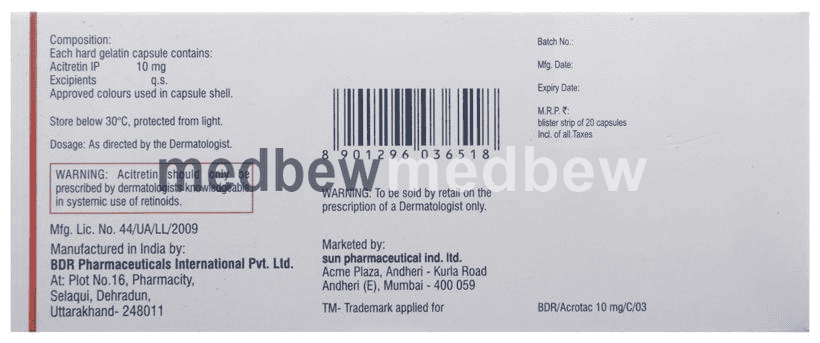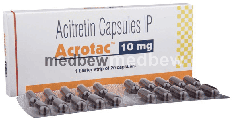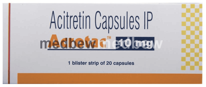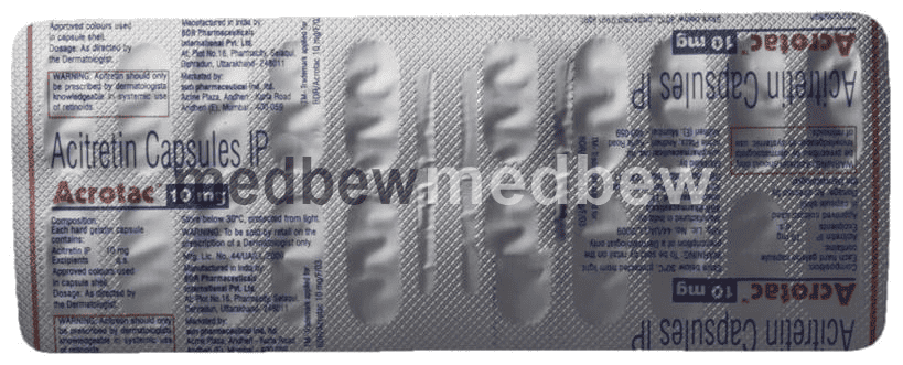 Acrotac 10mg Capsule is a medicine that is similar to vitamin A and is involved in the normal growth of skin cells. It is used in the treatment of psoriasis. It works by stopping the overgrowth and thickening of skin cells.