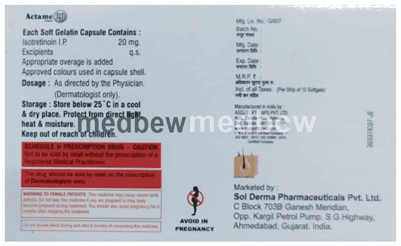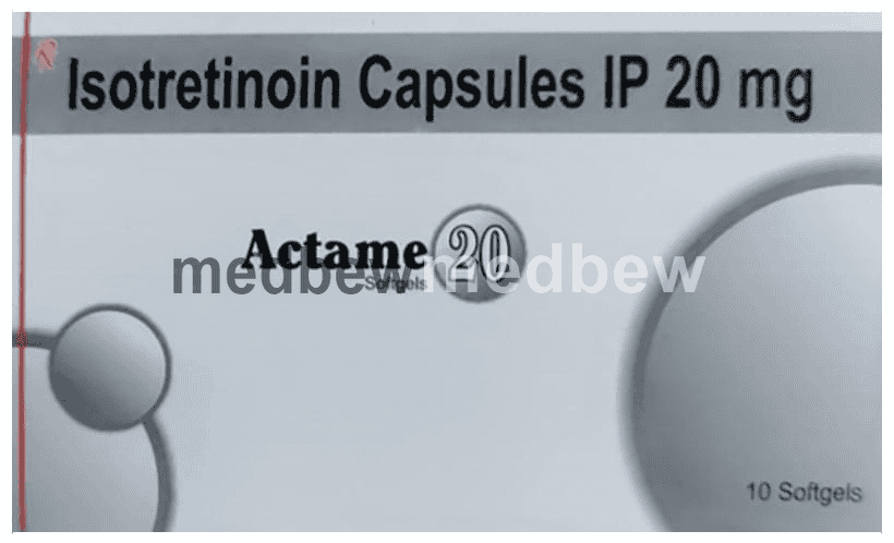 Actame 20mg Tablet belongs to a group of medicines called retinoids (vitamin A derivative). It is used to treat severe acne that has not responded to other treatments.