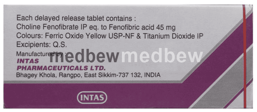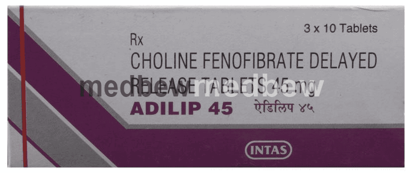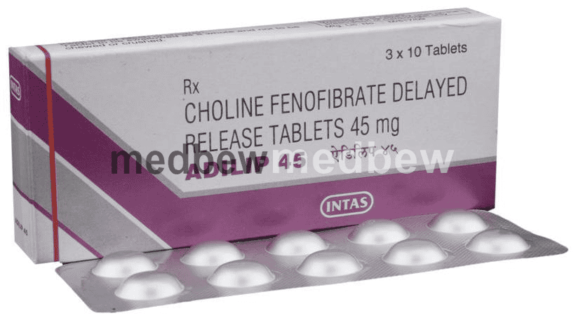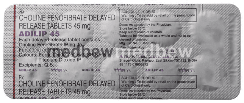 Adilip 45 Tablet DR is a medicine used to treat high cholesterol. This medicine helps by lowering triglycerides and “bad” cholesterol (LDL), while at the same time raising the levels of “good” cholesterol (HDL). Lowering cholesterol levels reduces the risk of heart attack and stroke.