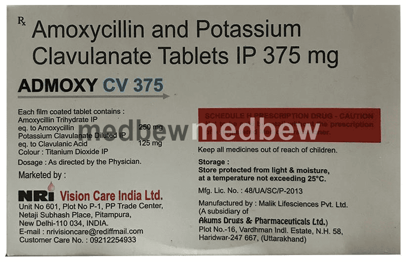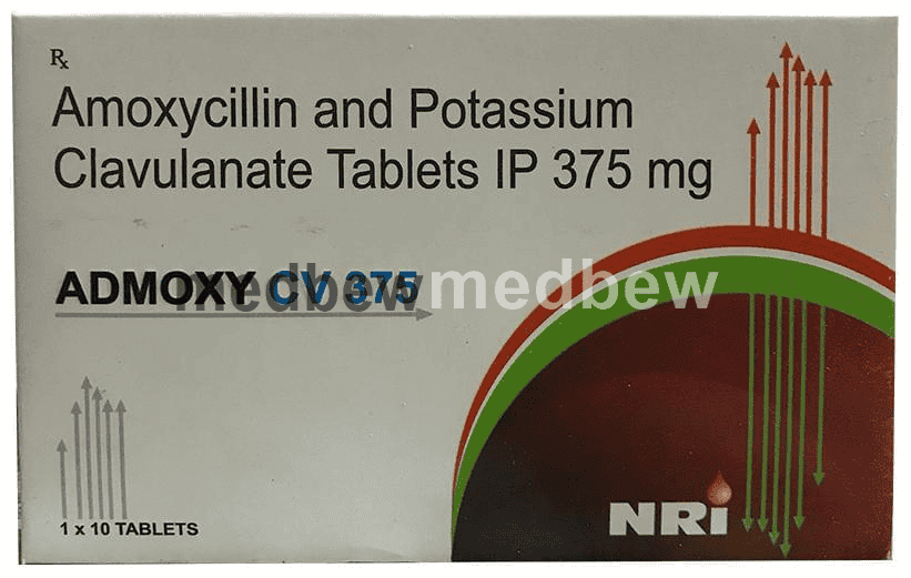 Admoxy CV 375 Tablet is a penicillin-type of antibiotic that helps your body fight infections caused by bacteria. It is used to treat infections of the lungs (e.g., pneumonia), ear, nasal sinus, urinary tract, skin and soft tissue. It will not work for viral infections such as the common cold.