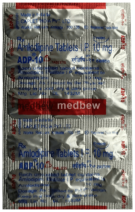 Adp 10 Tablet belongs to a class of medicines known as calcium channel blockers. It is used to treat high blood pressure (hypertension) and prevent angina (heart-related chest pain). It lowers blood pressure and reduces the heart’s workload, which helps prevent heart attacks and strokes.
