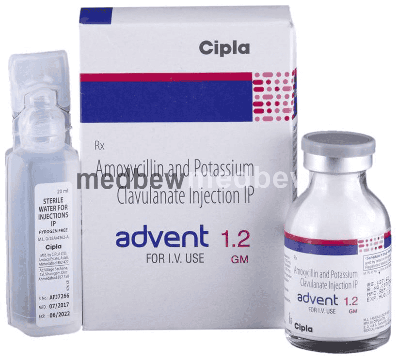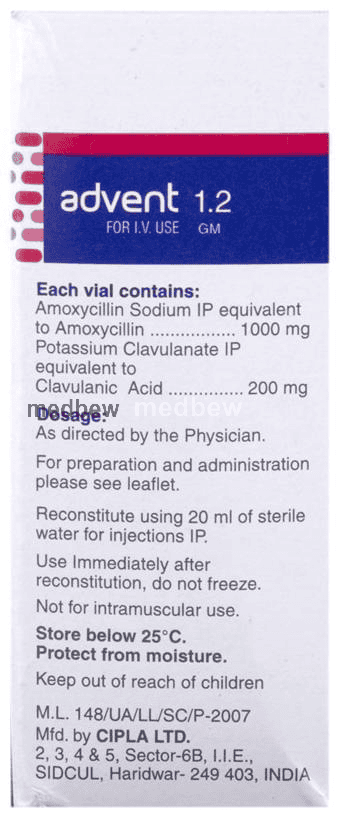 Advent 1.2gm Injection is a penicillin-type of antibiotic that helps your body fight infections caused by bacteria. It is used to treat infections of the lungs (e.g., pneumonia), ear, nasal sinus, urinary tract, skin, and soft tissue. It will not work for viral infections such as the common cold.