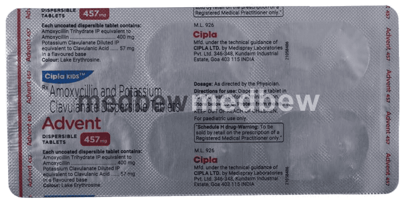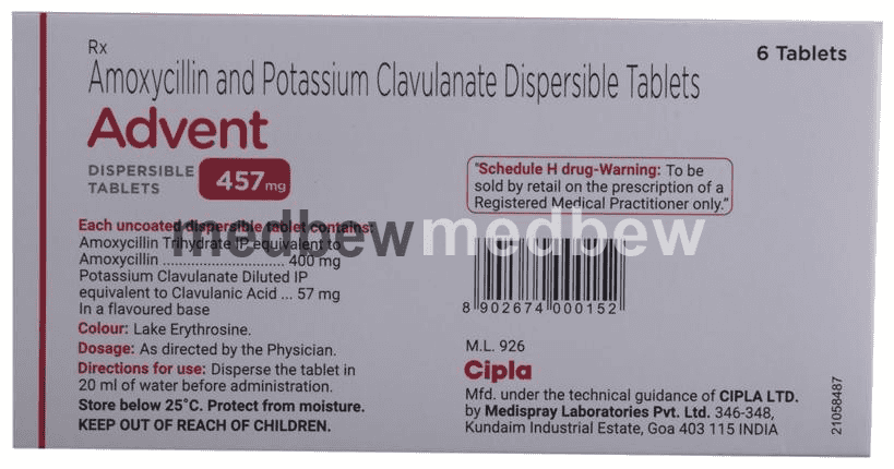 Advent 457mg Tablet DT is an antibiotic medicine that helps treat bacterial infections of the ear, nose, throat, chest, lungs, teeth, skin, and urinary tract. It is capable of killing bacteria that have become resistant to other therapies and thus also helps treat tuberculosis that is resistant to other treatments.