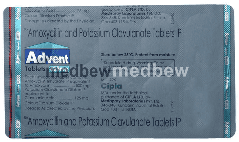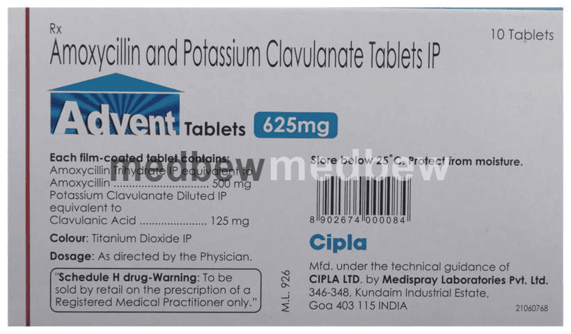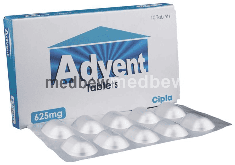 Advent 625 Tablet is a penicillin-type of antibiotic that helps your body fight infections caused by bacteria. It is used to treat infections of the lungs (e.g., pneumonia), ear, nasal sinus, urinary tract, skin and soft tissue. It will not work for viral infections such as the common cold.