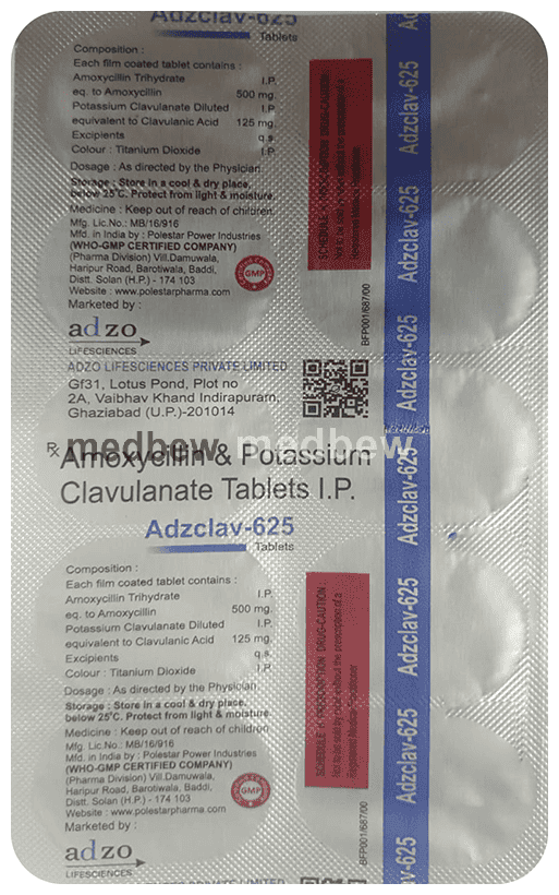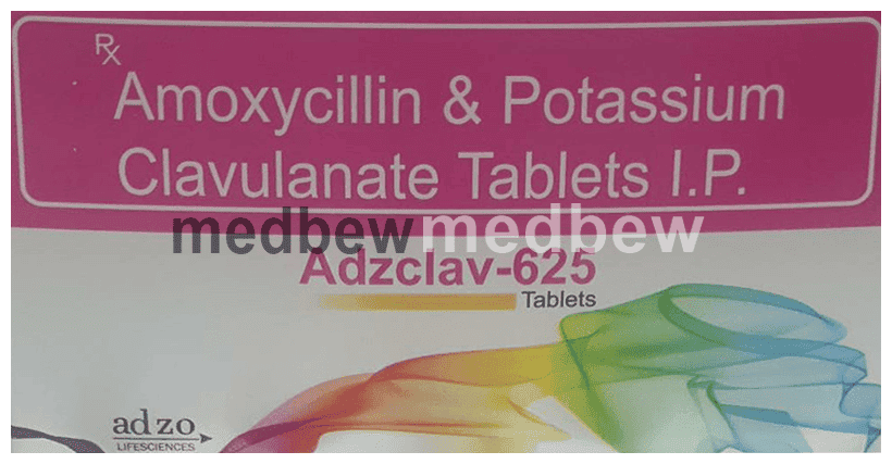Adzclav 625 Tablet is a penicillin-type of antibiotic that helps your body fight infections caused by bacteria. It is used to treat infections of the lungs (e.g., pneumonia), ear, nasal sinus, urinary tract, skin and soft tissue. It will not work for viral infections such as the common cold.