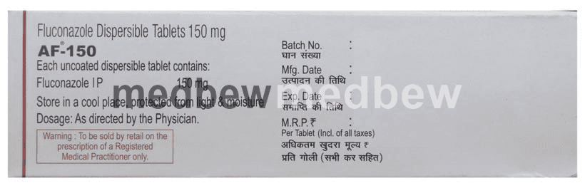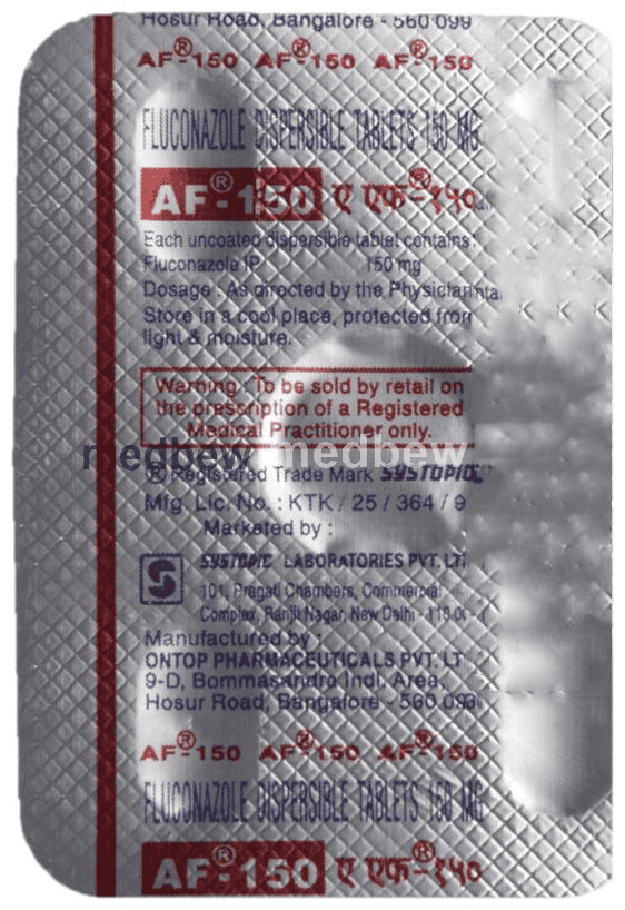 AF 150 Tablet DT is an antifungal medicine. It works by killing and stopping the growth of fungi that causes the infection. It helps treat infections of the mouth, throat, vagina, and other parts of the body.The dose and duration of treatment will depend on what you are being treated for. Make sure you complete the full course of treatment. This will ensure that the infection is completely cured and prevent it from returning.