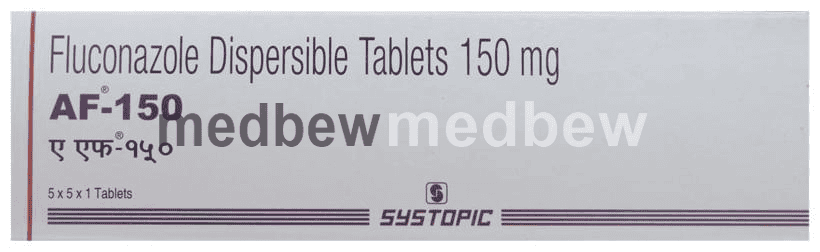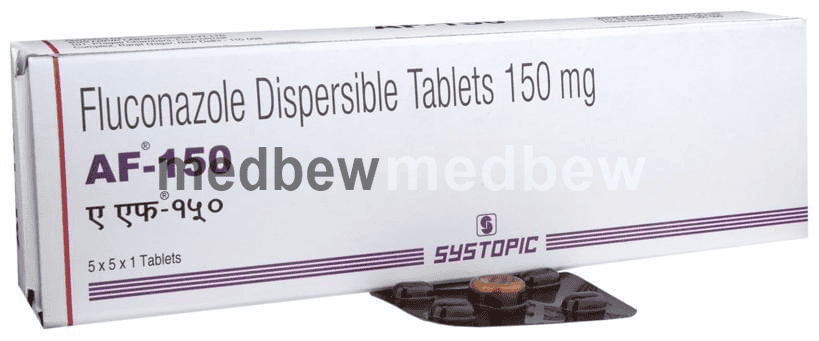 AF 150 Tablet DT is an antifungal medicine. It is used for the treatment of many fungal infections like Cryptococcal meningitis (fungal infection in the brain) and Coccidioidomycosis (a disease of the lungs). Additionally, it is helpful in the treatment of infections caused by Candida found in the bloodstream, body organs (e.g., heart, lungs) or urinary tract, mucosal thrush (infection affecting the lining of the mouth, throat, and denture sore mouth), and genital thrush (infection of the vagina or penis). It can also be used to treat skin infections like athlete’s foot, ringworm, jock itch, nail infection.