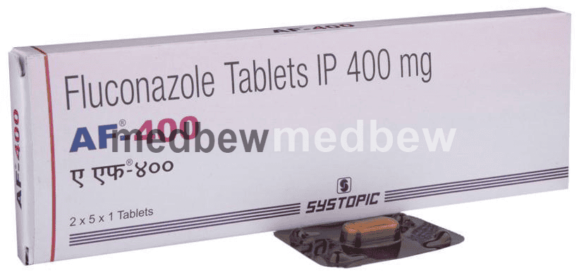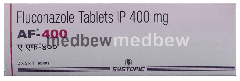AF 400 Tablet is an antifungal medicine. It is used for the treatment of many fungal infections like Cryptococcal meningitis (fungal infection in the brain) and Coccidioidomycosis (a disease of the lungs). Additionally, it is helpful in the treatment of infections caused by Candida found in the bloodstream, body organs (e.g., heart, lungs) or urinary tract, mucosal thrush (infection affecting the lining of the mouth, throat, and denture sore mouth), and genital thrush (infection of the vagina or penis). It can also be used to treat skin infections like athlete’s foot, ringworm, jock itch, nail infection.