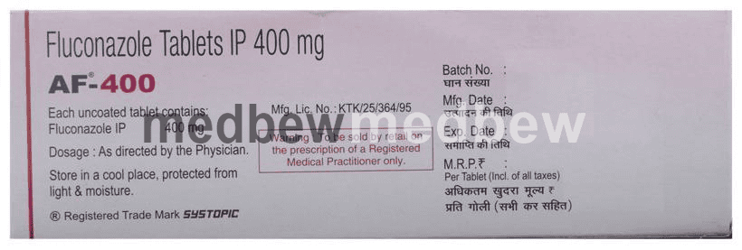 AF 400 Tablet is used to treat fungal infections of the mouth, throat, vagina, and other parts of the body including fingernails and toenails. It kills fungi by destroying the fungal cell membrane thereby stopping the growth of fungi.