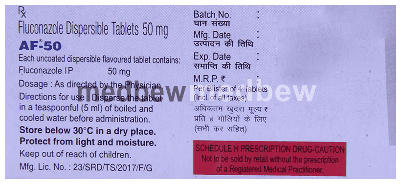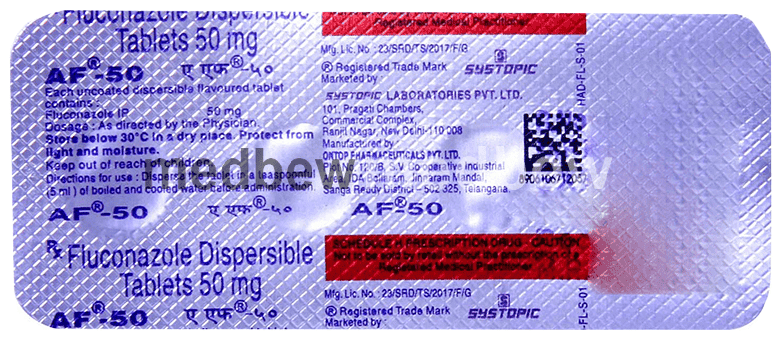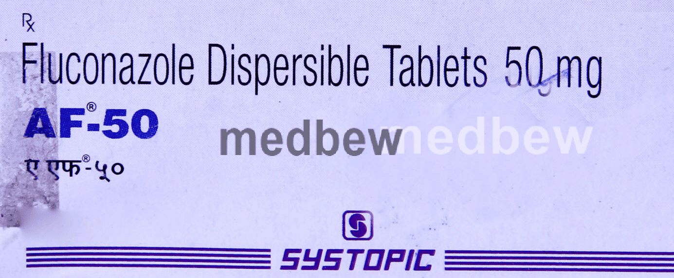AF 50 Tablet DT is an antifungal medicine. It is used for the treatment of many fungal infections like Cryptococcal meningitis (fungal infection in the brain) and Coccidioidomycosis (a disease of the lungs). Additionally, it is helpful in the treatment of infections caused by Candida found in the bloodstream, body organs (e.g., heart, lungs) or urinary tract, mucosal thrush (infection affecting the lining of the mouth, throat, and denture sore mouth), and genital thrush (infection of the vagina or penis). It can also be used to treat skin infections like athlete’s foot, ringworm, jock itch, nail infection.