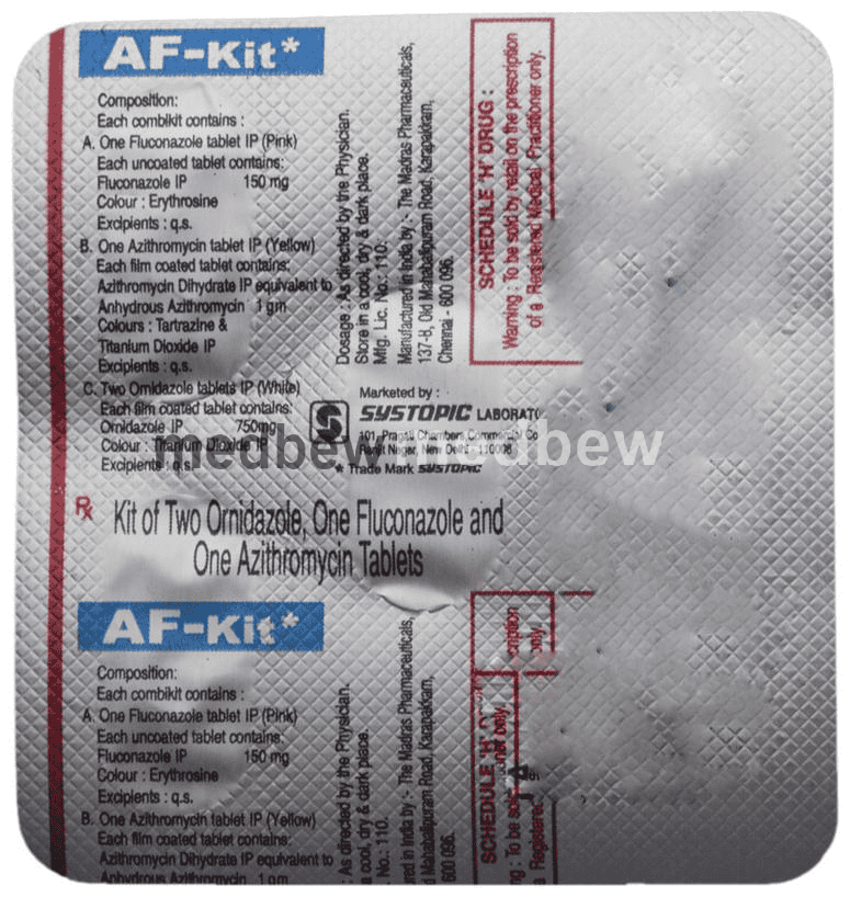 AF Kit Tablet is a combination of two antibiotics (Azithromycin and Ornidazole) and an antifungal (Fluconazole). Azithromycin stops bacterial growth by preventing the synthesis of essential proteins required by bacteria to carry out vital functions. Ornidazole kills other microorganisms in addition to bacteria by damaging their DNA. Fluconazole works by stopping the growth of fungi in the body. Together, they treat your infection effectively.