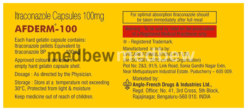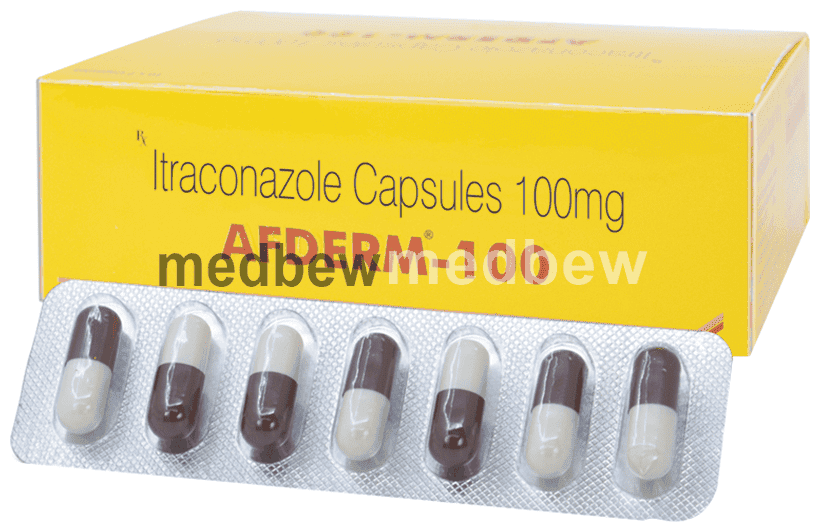 Afderm 100 Capsule belongs to a group of medicines called antifungals. It works by stopping the growth of fungi and is used to treat infections of the mouth, throat, vagina, and other parts of the body including fingernails and toenails. It kills fungi by destroying the fungal cell membrane.