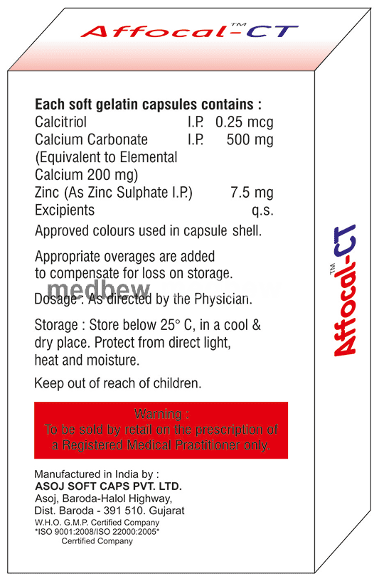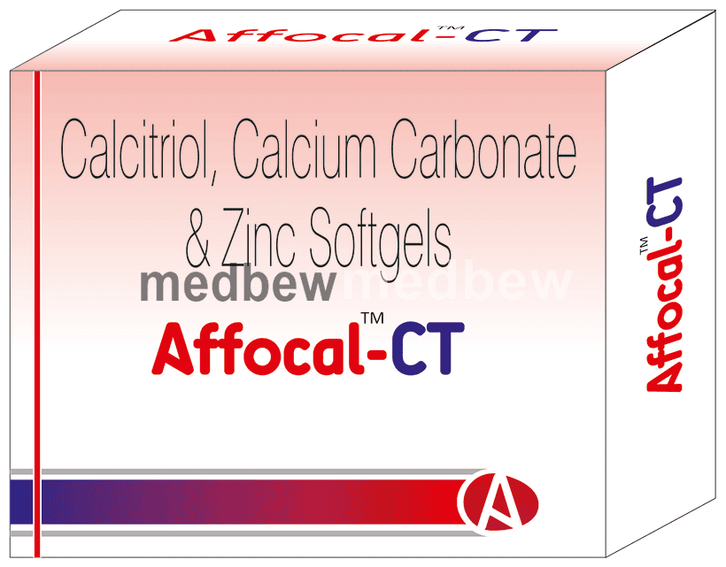 Affocal-CT Softgel is a combination of three medicines: Calcitriol, Calcium Carbonate and Zinc Sulfate which treat osteoporosis. Calcitriol helps your body effectively absorb Calcium Carbonate and additionally supports the muscles needed to avoid falls. Calcium Carbonate and Zinc Sulfate help build and maintain bones. Affocal-CT Softgel is a combination of three medicines: Calcitriol, Calcium Carbonate and Zinc Sulfate which treat osteoporosis. Calcitriol helps your body effectively absorb Calcium Carbonate and additionally supports the muscles needed to avoid falls. Calcium Carbonate and Zinc Sulfate help build and maintain bones.