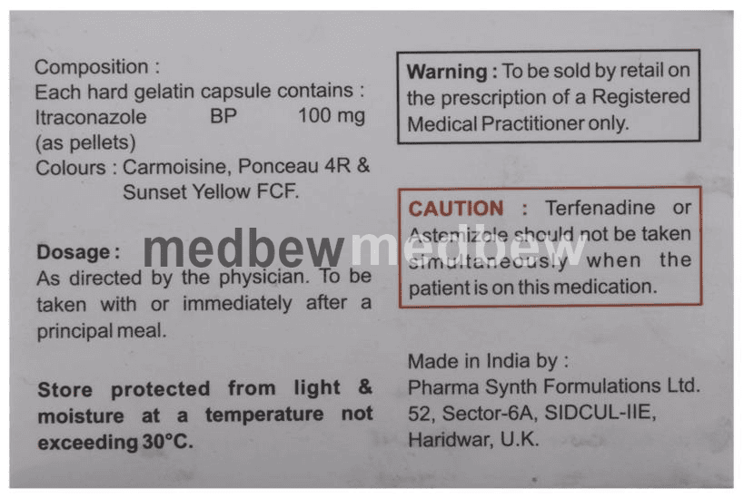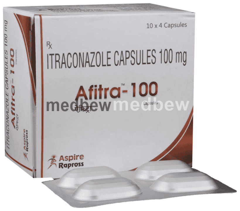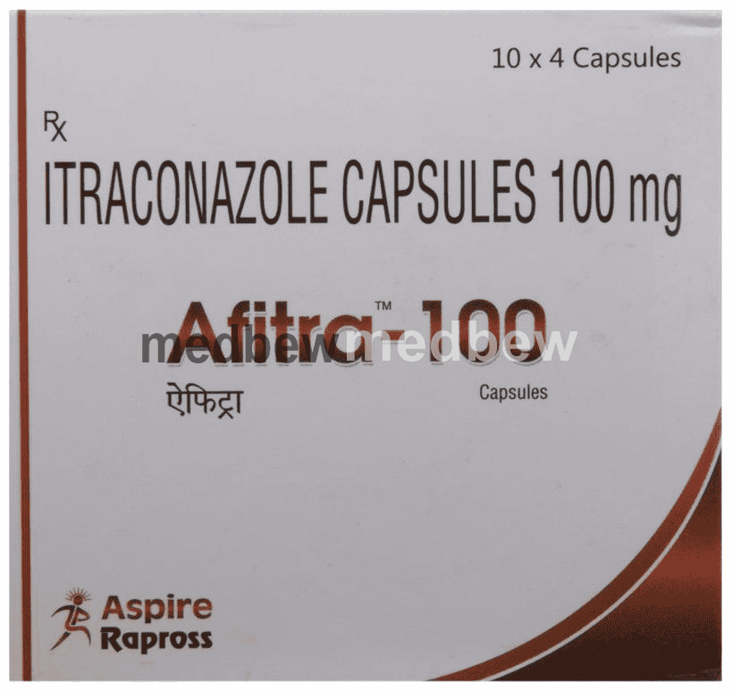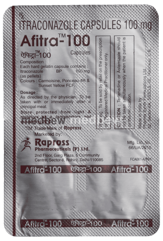 Afitra 100 Capsule belongs to a group of medicines called antifungals. It works by stopping the growth of fungi and is used to treat infections of the mouth, throat, vagina, and other parts of the body including fingernails and toenails. It kills fungi by destroying the fungal cell membrane.