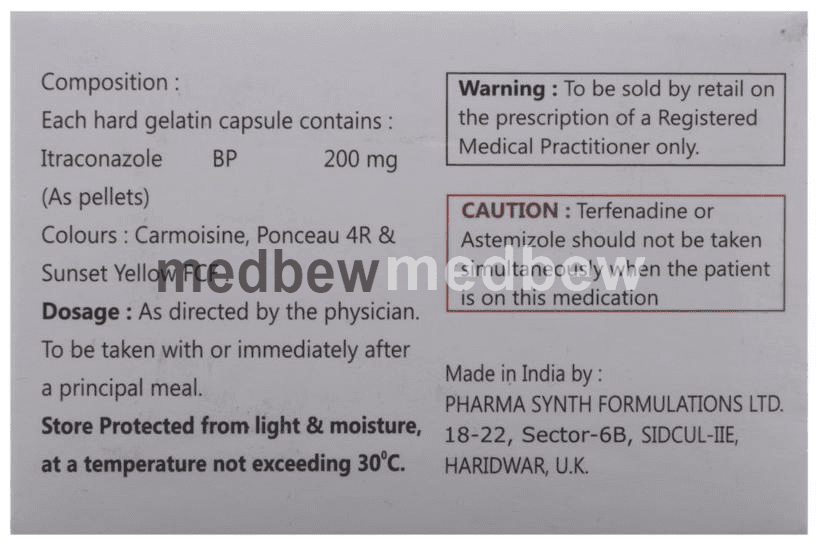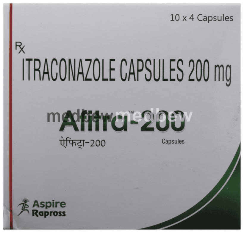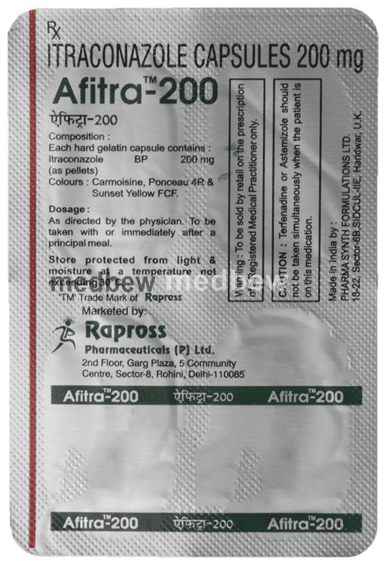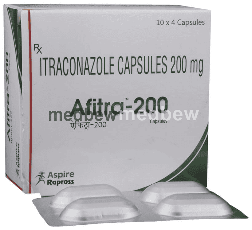Afitra 200 Capsule belongs to a group of medicines called antifungals. It works by stopping the growth of fungi and is used to treat infections of the mouth, throat, vagina, and other parts of the body including fingernails and toenails. It kills fungi by destroying the fungal cell membrane.
