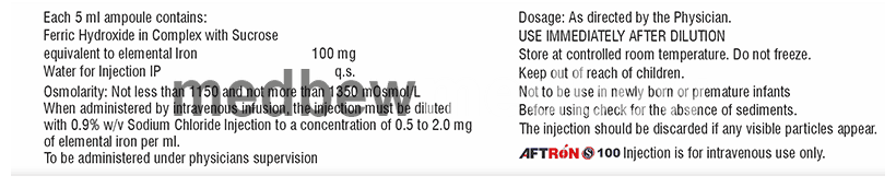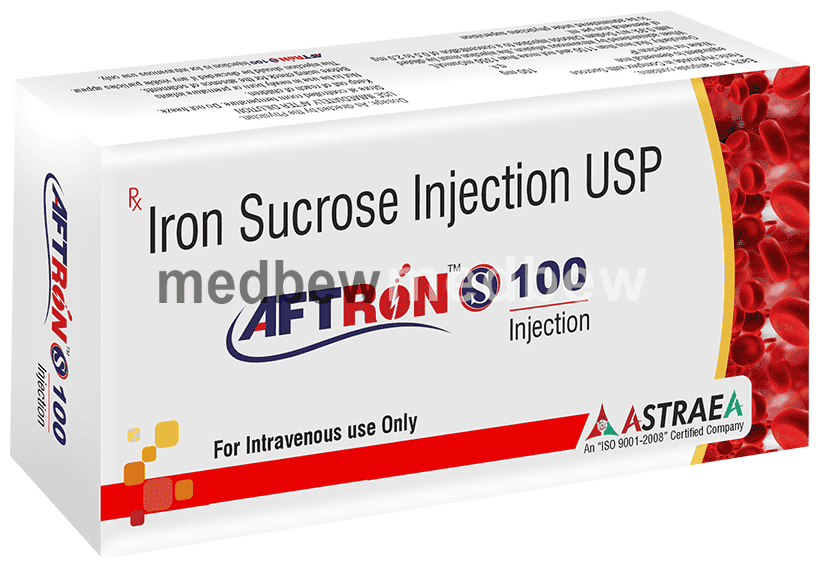 Aftron S 100 Injection is an iron replacement medicine. It is used to treat a type of anemia where you have too few red blood cells because you have too little iron in your body (iron-deficiency anemia). Iron is needed to produce the red blood cells that carry oxygen around your body.