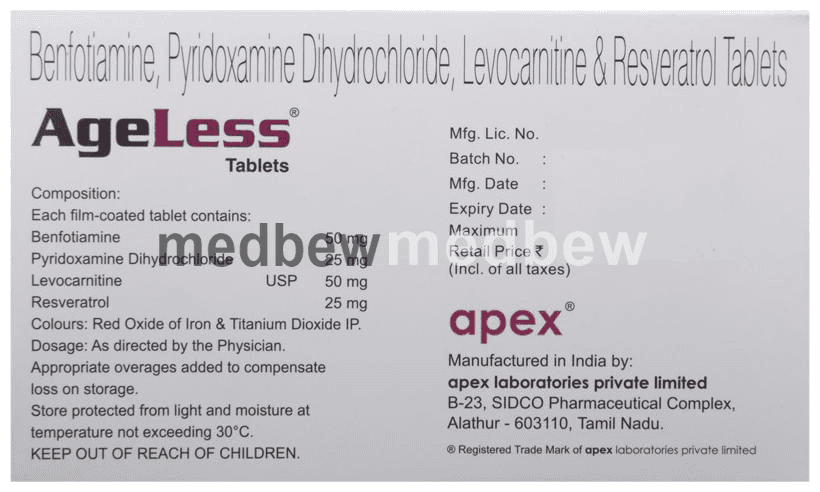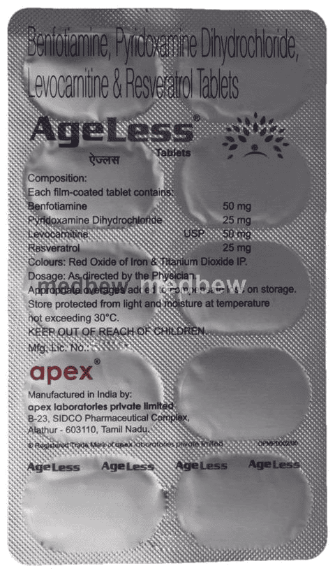 Ageless Tablet is a combination of four nutritional supplements: Benfotiamine, Levo-carnitine, Resveratrol, and Vitamin B6 (Pyridoxine). Together, these replenish the body’s stores of important nutrients.