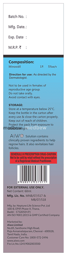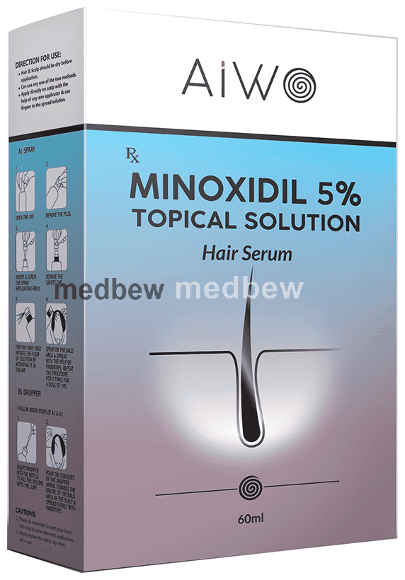 AIWO Minoxidil 5% Topical Solution is a medicine used to treat common hereditary hair loss. It can prevent further hair loss and help hair to re-grow. It works by increasing blood flow to the hair follicles on your scalp, which prevents hair cell death and also enhances new hair growth. It is most effective for baldness or thinning at the top of the scalp but less effective at the front or for receding hairline. Benefits are less likely if you have been bald for many years or have a large area of hair loss. AIWO Minoxidil 5% Topical Solution is not suitable for sudden or unexplained hair loss. It is considered a safe medicine. There are separate products for men and women and you should follow your doctor’s instructions carefully while using AIWO Minoxidil 5% Topical Solution. Regrowth of hair improves your appearance, boosts your confidence, and enhances your social life. Use it regularly to maintain hair growth and to get the maximum benefits. Consult your doctor if you notice any changes in the hair growth while using AIWO Minoxidil 5% Topical Solution.