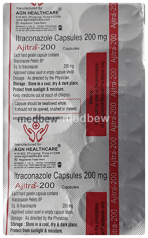 Ajitra 200 Capsule belongs to a group of medicines called antifungals. It works by stopping the growth of fungi and is used to treat infections of the mouth, throat, vagina, and other parts of the body including fingernails and toenails. It kills fungi by destroying the fungal cell membrane.