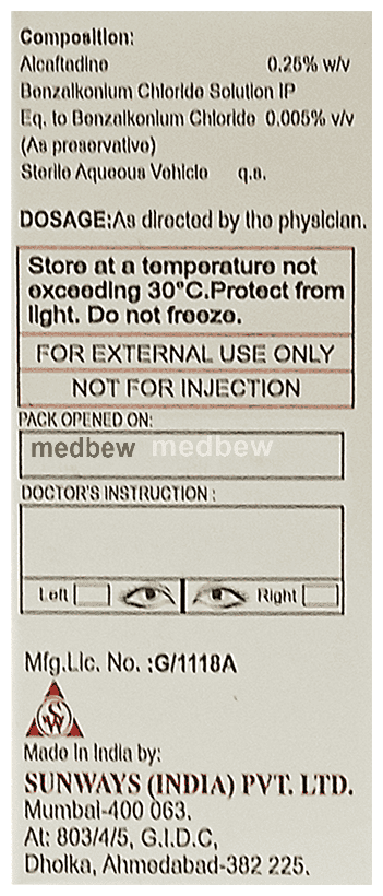 Alcatop Eye Drop is an antihistaminic medication. It is used to treat inflammation of the eyes (redness and swelling) caused by various allergies. It helps in short-term or sudden allergic reactions in the eye.