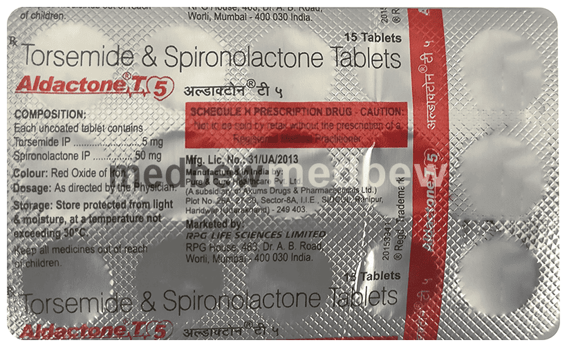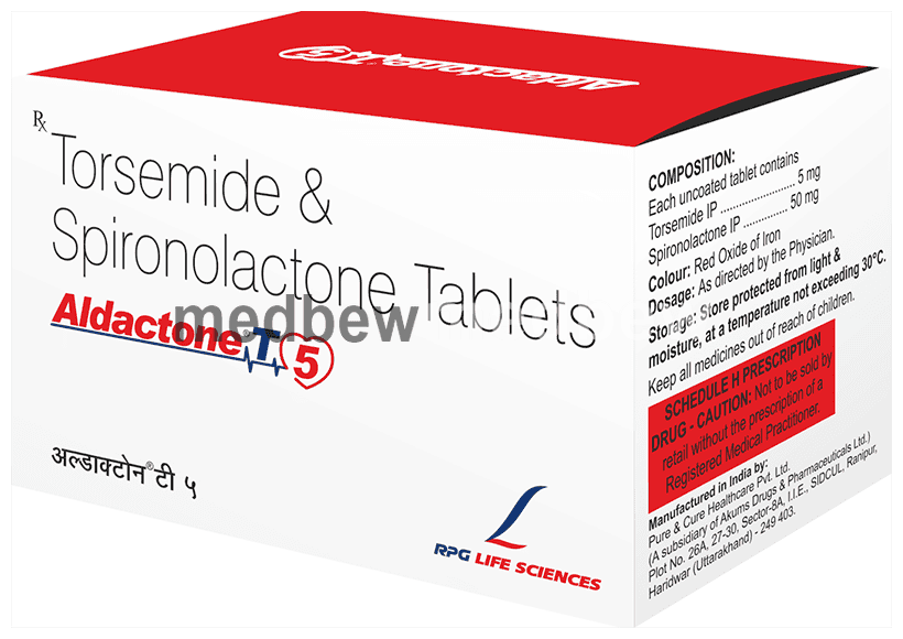 Aldactone T 5 Tablet is a combination of two medicines used to reduce excess fluid levels in the body while maintaining the potassium balance. It is used to treat edema (fluid overload) and some cases of hypertension.