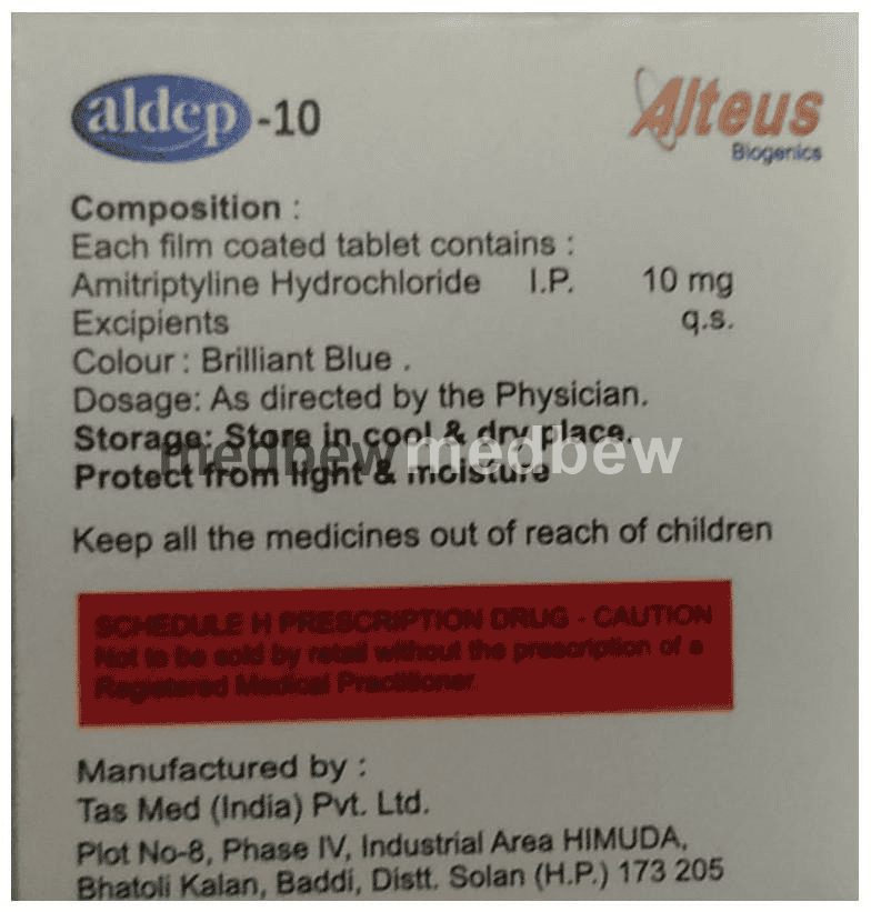 Aldep 10 Tablet contains Amitriptyline, a tricyclic antidepressant. It has anticholinergic and sedative properties. It prevents the reuptake, and hence the inactivation of neurotransmitters called noradrenaline and serotonin, that are present at the nerve terminals in our brain. Reuptake prevention of these monoamine neurotransmitters potentiate their action in the brain. This appears to be associated with the antidepressant activity and helps in regulating the mood. It also stops the transmission of pain signals from nerves to the brain thereby relieving neuropathic pain (pain from damaged nerves).