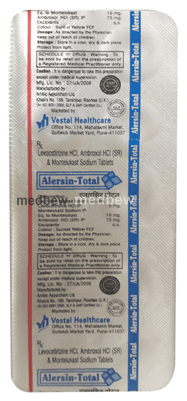 Alersin-Total Tablet SR is a combination medicine used in the prevention of asthma. It relieves allergy symptoms such as runny nose, stuffy nose, sneezing, watery eyes and congestion or stuffiness. It also helps in relaxing the muscles of the air passages, thus widening it and making it easier to breathe.