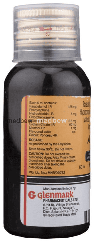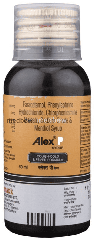 Alex P Syrup is used in the treatment of common cold symptoms like runny nose, stuffy nose, sneezing, watery eyes and congestion or stuffiness. It also helps in relieving pain and fever.