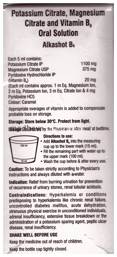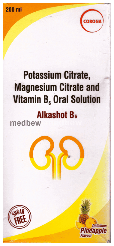 Alkashot B6 Oral Solution Delicious Pineapple Sugar Free is a combination of three medicines. It is used in the treatment and prevention of kidney stones. It works by preventing the formation as well as breaking down the crystals in the kidneys.