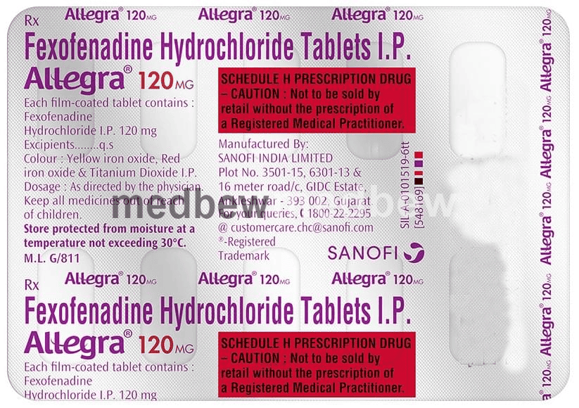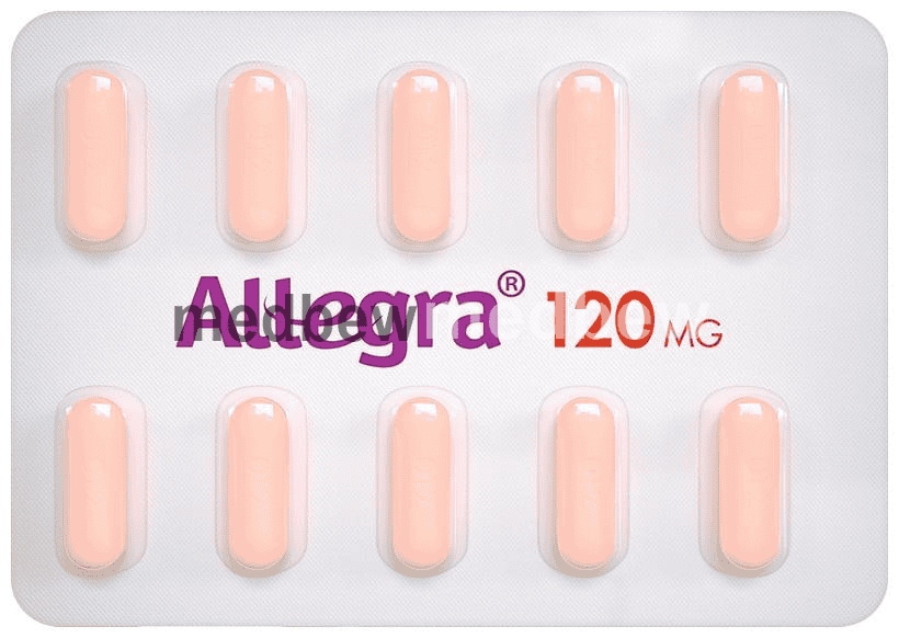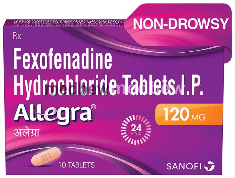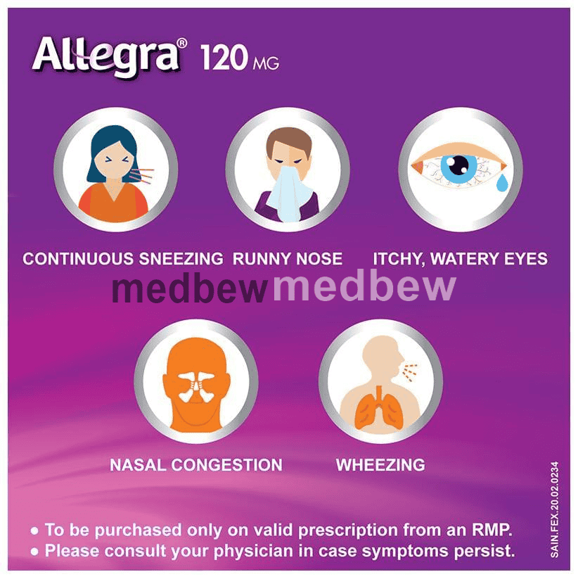 Allegra 120mg Tablet is an anti-allergy medicine used in the treatment of allergic symptoms such as runny nose, congestion or stuffiness, sneezing, itching, swelling, and watery eyes. It also helps treat skin allergies with itching, redness, or swelling.