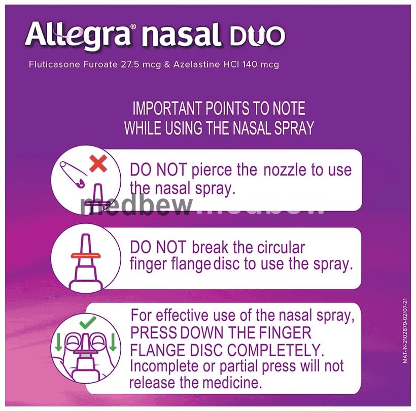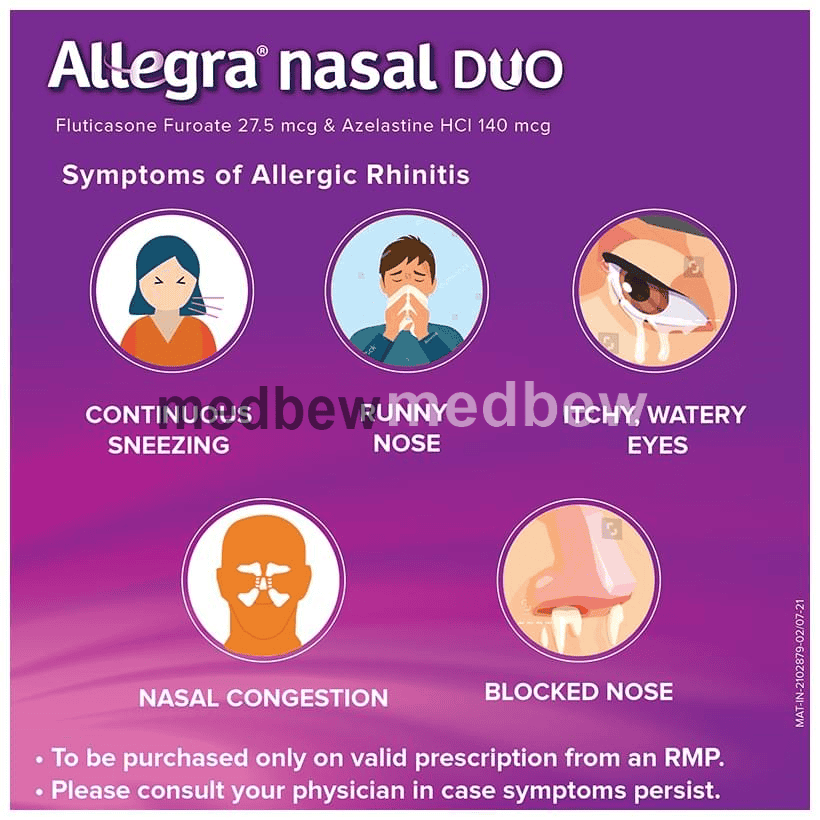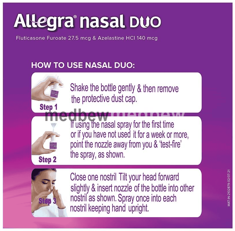 Allegra Nasal Duo Spray is a combination medicine used in the treatment of allergy symptoms such as runny nose, stuffy nose, sneezing, watery eyes and congestion or stuffiness.